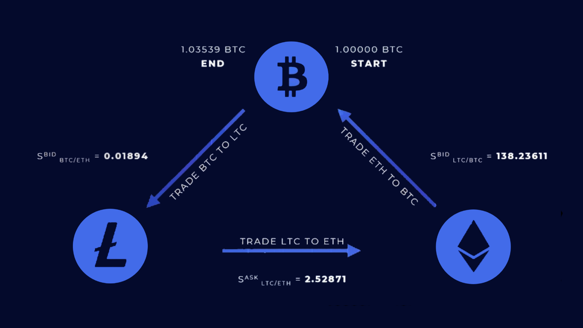 In order to better illustrate how triangular arbitrage functions to generate profit, we have constructed an illustration to the right. As you can see in this example, we have 3 different asset pairs on a single exchange. On this exchange, we have an LTC/BTC, LTC/ETH, and ETH/BTC pair. The trading pattern to take advantage of an arbitrage opportunity is, therefore, the following: