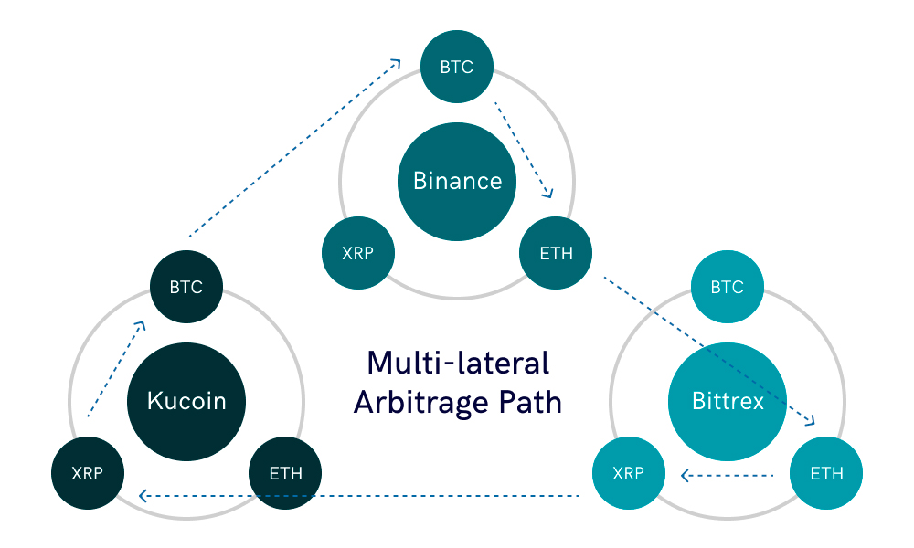 Triangular arbitrage is an event that can occur on a single exchange (or across multiple exchanges) where the price differences between three different cryptocurrencies lead to an arbitrage opportunity, since many exchanges have a number of markets with a variety of quote currency options. This opens up a long list of triangular trading patterns that can be leveraged to take advantage of inefficiencies in an individual exchange pricing.